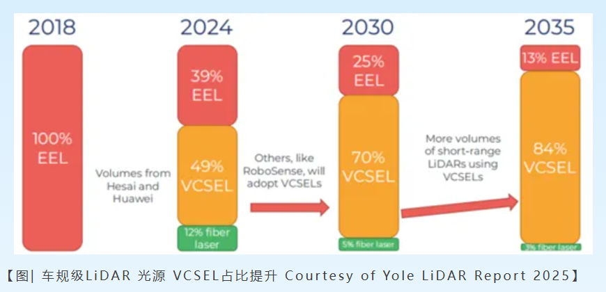 ? ? ? 在半固態(tài)激光雷達(dá)中,掃描部件通常采用 MEMS 或棱鏡/轉(zhuǎn)鏡的方式,而激光的光源也逐漸從光纖激光器或 EEL 切換至 VCSEL。自 2024 年起,VCSEL 在半固態(tài)激光雷達(dá)中的出貨量已經(jīng)接近50%。隨著 VCSEL 在新一代激光雷達(dá)系統(tǒng)中展現(xiàn)出的低溫漂系數(shù)、窄線寬、低功耗等優(yōu)勢(shì),采用 VCSEL 的激光雷達(dá)比例將會(huì)逐步上升。