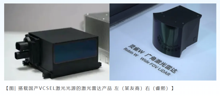 ? ? ? 2024 年量產(chǎn)上車(chē)的激光雷達(dá)中,除了來(lái)自海外廠商(如 Lumentum)的 VCSEL 產(chǎn)品外,國(guó)產(chǎn) VCSEL 芯片也已經(jīng)逐步實(shí)現(xiàn)前裝上車(chē)。例如,某友商的 VCSEL 芯片被應(yīng)用于華為系的 D3 主雷達(dá),而睿熙科技的 VCSEL 芯片則被用于圖達(dá)通系Robin-W靈雀W廣角激光雷達(dá)。邁入 2025 年,搭載國(guó)產(chǎn) VCSEL 芯片的全固態(tài)激光雷達(dá)產(chǎn)品也將逐步在量產(chǎn)車(chē)型上得到應(yīng)用。