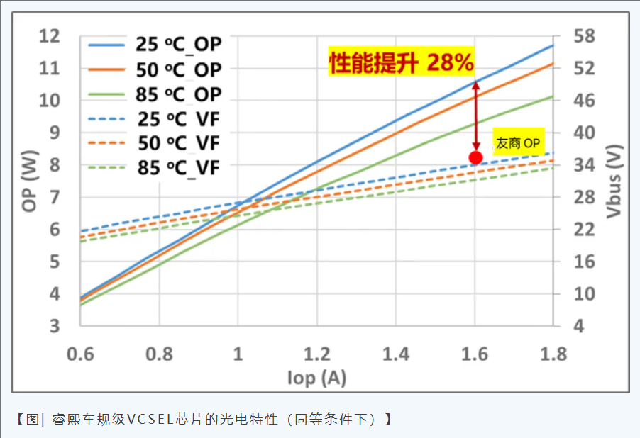 ? ? ? 在相同激光照射距離下,更高的 PCE 可以實(shí)現(xiàn)更遠(yuǎn)的探測(cè)距離,或者在相同距離下實(shí)現(xiàn)更低的功耗。得益于睿熙的重構(gòu)多結(jié) SOMJ 架構(gòu),在同等測(cè)試條件下,睿熙 VCSEL 芯片能夠相較友商提升 28%。