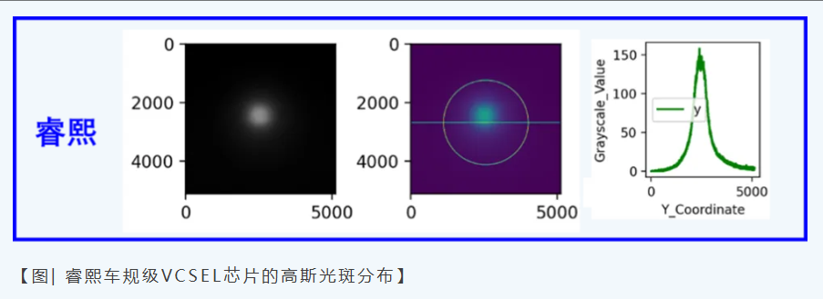 ? ? ? 低發(fā)散角有助于簡(jiǎn)化激光雷達(dá)的光路設(shè)計(jì)并提升激光雷達(dá)的測(cè)距范圍。得益于睿熙的重構(gòu)多結(jié)架構(gòu),睿熙 VCSEL 芯片已經(jīng)可以做到 8°~10°的發(fā)散角,並且呈現(xiàn)高度集中化的高斯光斑分布,這將大大簡(jiǎn)化光學(xué)設(shè)計(jì)并提升激光雷達(dá)的測(cè)距能力。